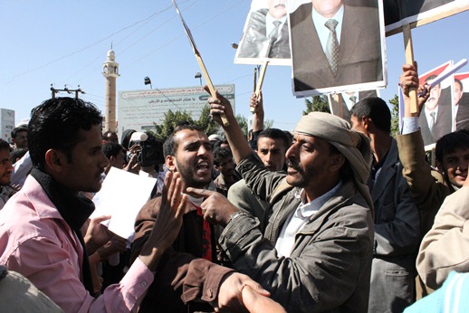 A pattern of violence became almost familiar on Monday when once again several hundred activists gathered outside the capital’s Sana’a University chanting: “Saleh leave, all the people hate you.” As on previous days, supporters of President Ali Abdullah Saleh were also present, waving uniform placards of the president, whilst carrying sticks and batons. After attempts to keep the two sides apart failed the batons were put to use and stones were thrown.