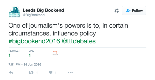The Index on Censorship Big Debate took place at the 5th annual Leeds Big Bookend Festival this week, where journalists and authors were invited to discuss which has the biggest impact: journalism or fiction. Index’s magazine editor Rachael Jolley was joined by assistant features editor of The Yorkshire Post Chris Bond, Yorkshire-based journalist and author Yvette Huddleston and author of the award- winning Promised Land Anthony Clavane to explore which medium is more influential and why, as part of a series of Time To Talk debates held by Eurozine. Audio from the debate will be available at Time to Talk or listen below.