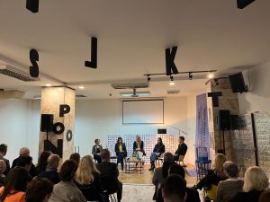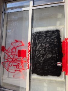 I heard a lot about the suppression of protest and the media, not only through individual conversations, but also at the Human Rights House (HRH), just down the road from the National Assembly and the Ćaciland encampment. The front of the office has been daubed with red graffiti which covers the HRH logo: the authorities have refused to remove it for them. At least the building still rents space to the HRH Serbia team, alongside other civic society organisations.