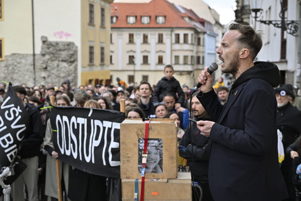 Author Michal Hvorecký speaks to a crowd on the eighth anniversary of Jan Kuciak’s murder. Photo: Milan Illik