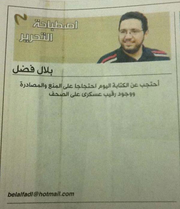 A number of independent writers, including Belal Fadl, Naglaa Bedir and Tarek El-Shenawy, wrote only a uniform note in their regular columns: “I did not write today in protest against censorship, confiscation of newspapers and the presence of military censors on papers.”